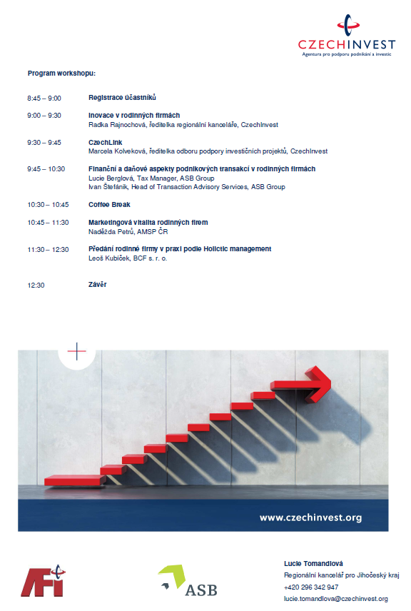 Dovolujeme si Vás pozvat na konferenci pořádanou Agenturou CzechInvest a odborníky na problematiku rodinných firem, která proběhne 8. listopadu v Jihočeském vědeckotechnickém parku. Téma letošní konference „Plánování a řízení v rodinných firmách“. Udržení tradice rodinných firem je pro českou i světovou ekonomiku nesmírně důležité. I proto je naším cílem připravit české rodinné firmy na úspěšné předání řízení nastupující generaci.Buďte připraveni a získejte informace, které Vám i Vašim nástupcům pomohou čelit novým výzvám.