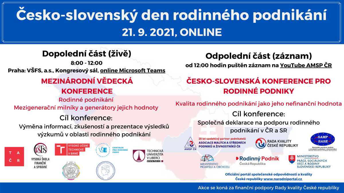 V rámci Česko-slovenského dne rodinného podnikání se můžete těšit na 2 různé konference, které budou na sebe navazovat. Jedná se o Mezinárodní vědeckou konferenci, která bude věnována tématu „Rodinné podnikání: Mezigenerační milníky a generátory jejich hodnoty“ a o Česko-slovenskou konferenci pro rodinné podniky na téma „Kvalita rodinného podnikání jako jeho nefinanční hodnota“.