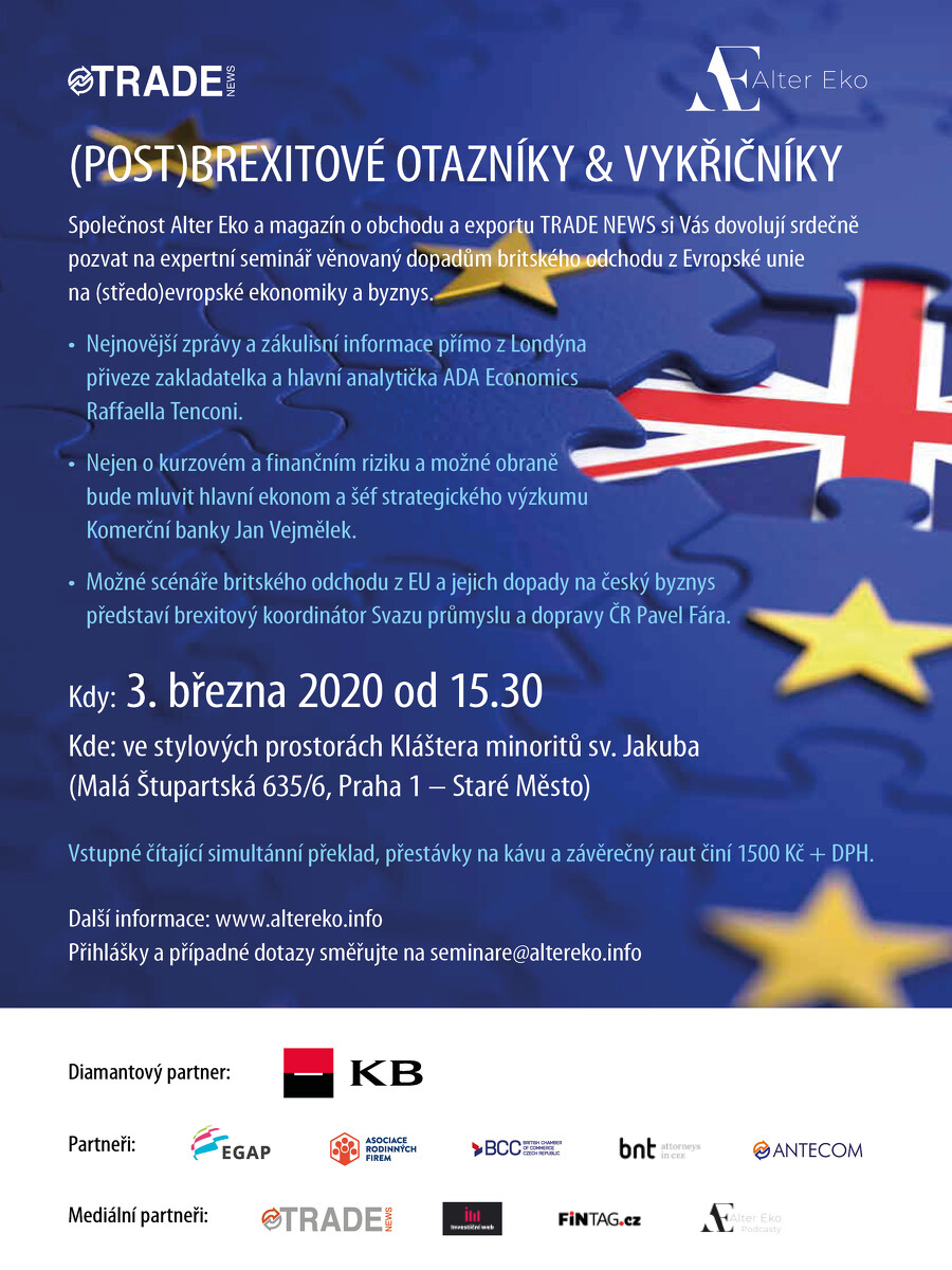 Dovolujeme si Vás pozvat na první ze série odborných seminářů, které se letos uskuteční pod hlavičkou magazínu TRADE NEWS a společnosti Alter Eko. Pod názvem (Post)brexitové otazníky & vykřičníky se bude věnovat dopadům britského odchodu z Evropské unie na (středo)evropské ekonomiky a byznys.