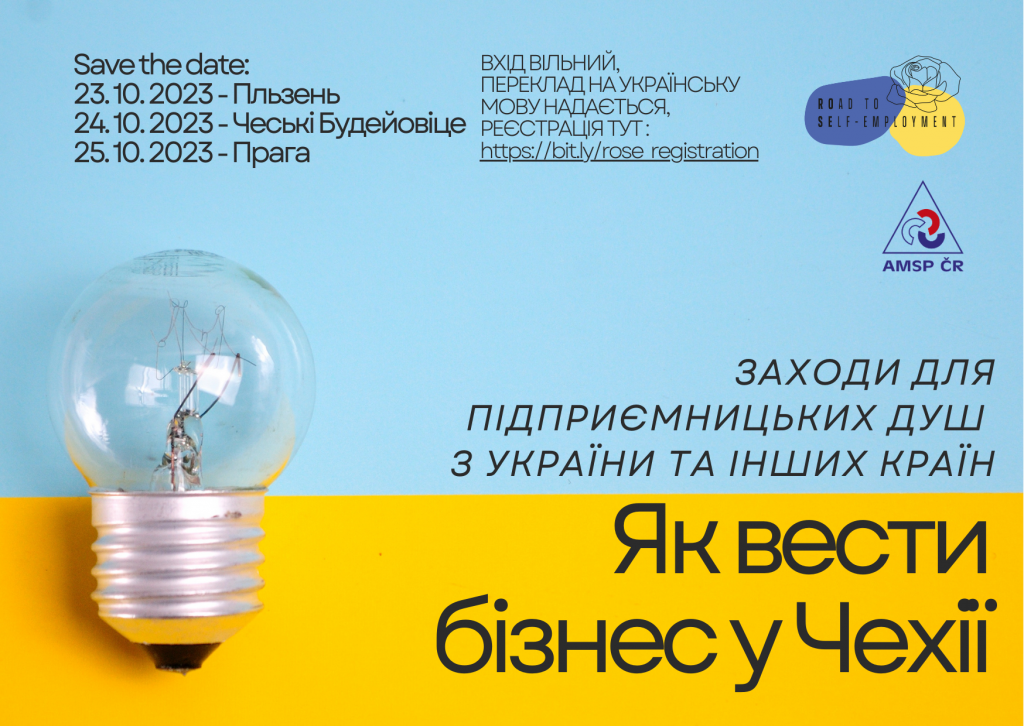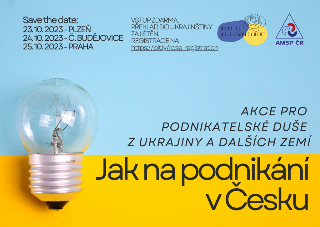 AMSP ČR si Vás dovoluje pozvat na 3denní roadshow na podporu podnikání ukrajinských imigrantů v Čechách. Akce se budou konat 23.10. v Plzni (DEPO2015), 24.10. v Českých Budějovicích (Riegrova51) a 25.10. v Praze (Podnikatelské a inovační centrum hl. m. Prahy) a je určena všem cizincům, kteří zvažují podnikání jako možnou cestu k samostatné výdělečné činnosti. Na akci bude představeno, jak si založit živnostenský list, jaké možnosti podnikání v ČR existují a kde hledat podporu.