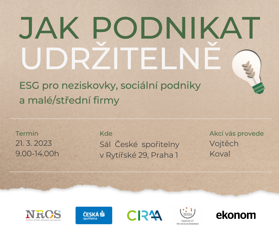 Rádi bychom Vás jménem Asociace malých a středních podniků a živnostníků ČR pozvali na akci s názvem: Jak podnikat udržitelně. Určeno pro neziskovky, sociální podniky a malé/střední firmy. Konferenci pořádá NROS, ve spolupráci CIRAA a TESSEA. Partnerem konference je Česká spořitelna – sociální bankovnictví.