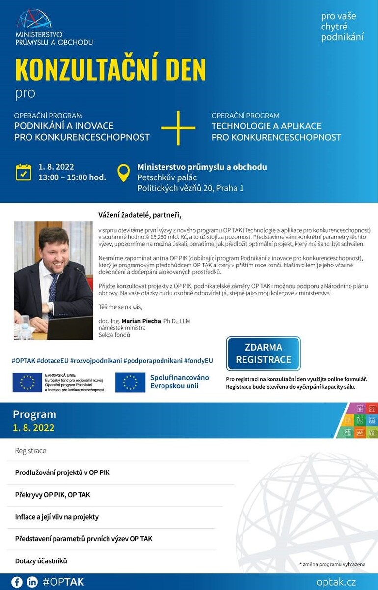 Dovolujeme si Vás pozvat na Konzultační den Operačního programu Technologie a aplikace pro konkurenceschopnost a Národního plánu obnovy, který je určený zejména pro zájemce o podporu. Akci pořádá Ministerstvo průmyslu a obchodu.