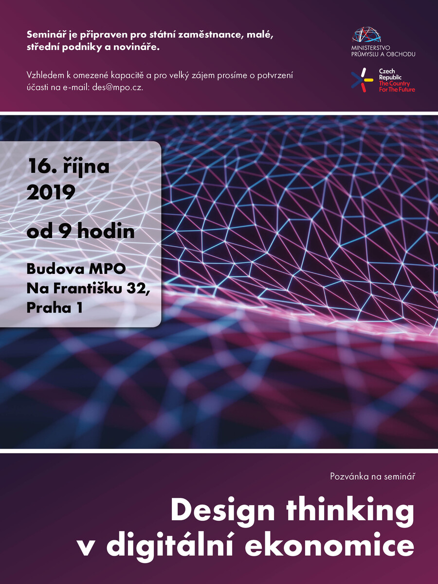 Dovolujeme se Vás pozvat na seminář na téma Design Thinking v digitální ekonomice, který se uskuteční dne 16. října 2019 v budově MPO, Na Františku 32.