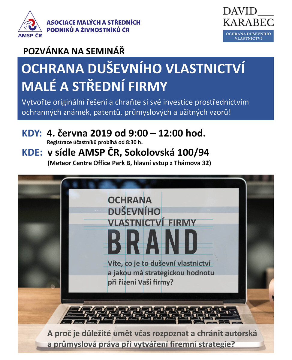 Jménem Asociace malých a středních podniků a živnostníků ČR a společnosti JUDr. David KARABEC, s.r.o si Vás dovolujeme pozvat na seminář na téma: „OCHRANA DUŠEVNÍHO VLASTNICTVÍ MALÉ A STŘEDNÍ FIRMY.“