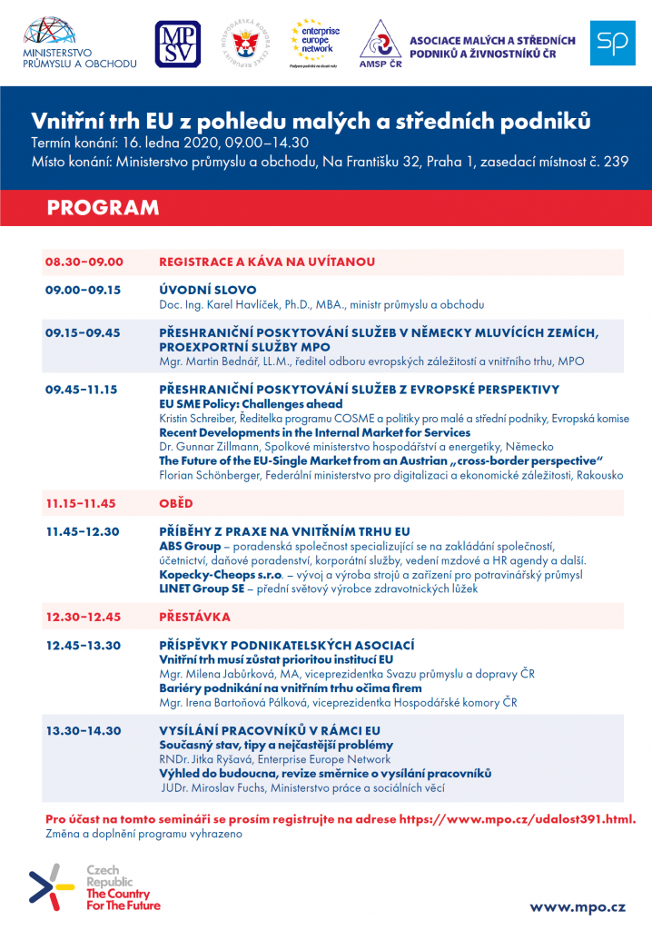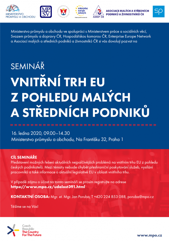 Ministerstvo průmyslu a obchodu ČR ve spolupráci s partnery pořádá další z cyklu seminářů pro podnikatele nazvaný „Vnitřní trh EU z pohledu malých a středních podniků“. Cílem semináře je poskytnout praktické rady a informace podnikatelům, kteří podnikají na vnitřním trhu EU a zejména v německy mluvících zemích. Seminář se bude věnovat přeshraničnímu poskytování služeb, vysílání pracovníků, možnostem financování pro malé a střední podniky a dalším tématům. Pozvání tentokrát přijali mimo jiné zástupci Evropské komise a německé a rakouské státní správy.