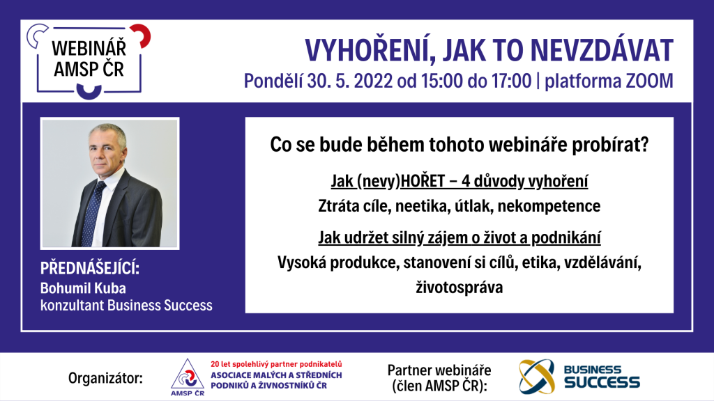 Rádi bychom Vás pozvali na společný webinář s naším členem, společností Business Success, spol. s r.o., na téma „Vyhoření, jak to nevzdávat“.