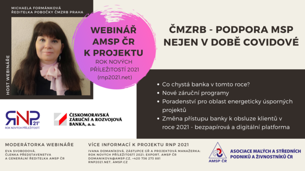 Moderátorkou webináře bude Eva Svobodová, členka představenstva a generální ředitelka AMSP ČR. Jejím hostem bude ředitelka pobočky ČMZRB Praha (Českomoravská záruční a rozvojová banka) Michaela Formánková.