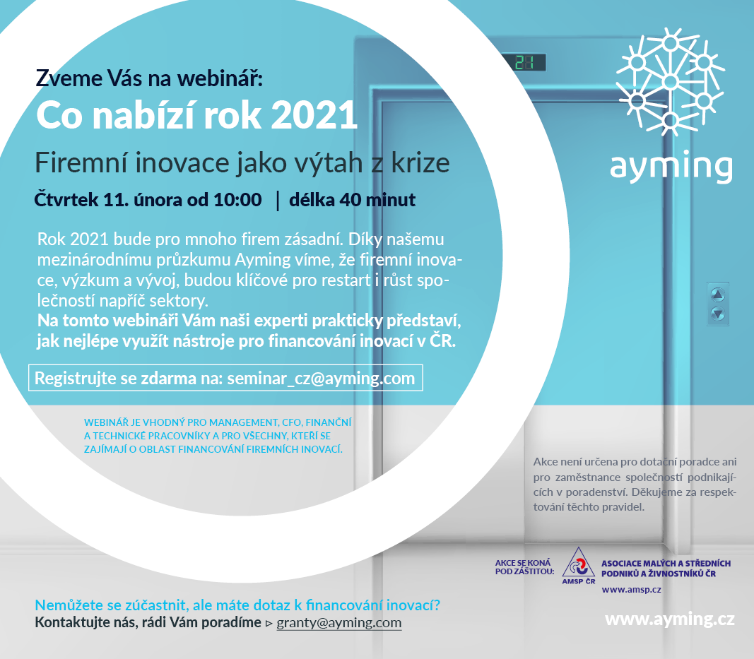 Dovolujeme si Vás pozvat na webinář na téma: Co nabízí rok 2021 – Firemní inovace jako výtah z krize, který pořádá spol. Ayming Česká republika s.r.o., člen AMSP ČR