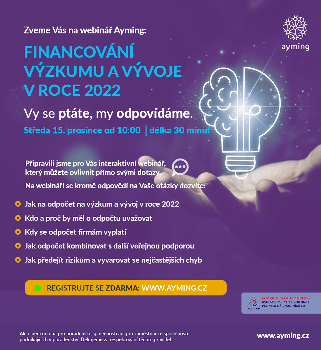 Dovolujeme si Vás pozvat na webinář na téma „Financování výzkumu a vývoje v roce 2022“, který pořádá společnost webinář Ayming Česká republika s.r.o., člen AMSP ČR.