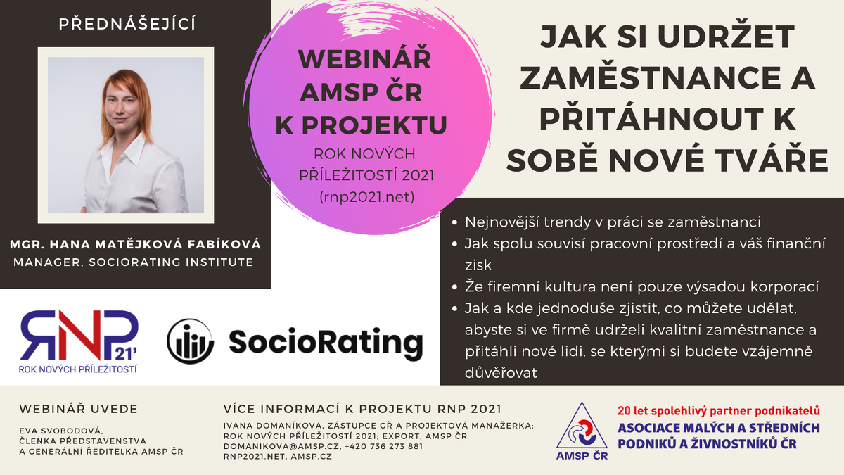 Rádi bychom Vás jménem Asociace malých a středních podniků a živnostníků ČR pozvali na webinář na téma: „Jak si udržet zaměstnance a přitáhnout k sobě nové tváře“. Webinář se koná v rámci našeho projektu Rok nových příležitostí 2021.