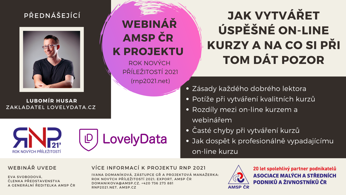Tento webinář je pro všechny, kteří chtějí vytvářet úspěšné on-line kurzy. Povede ho Lubomír Husar, zakladatel české streamovací platformy LovelyData.cz, která nabízí on-line kurzy. Výběru lektorů věnuje LovelyData spoustu času a úsilí.