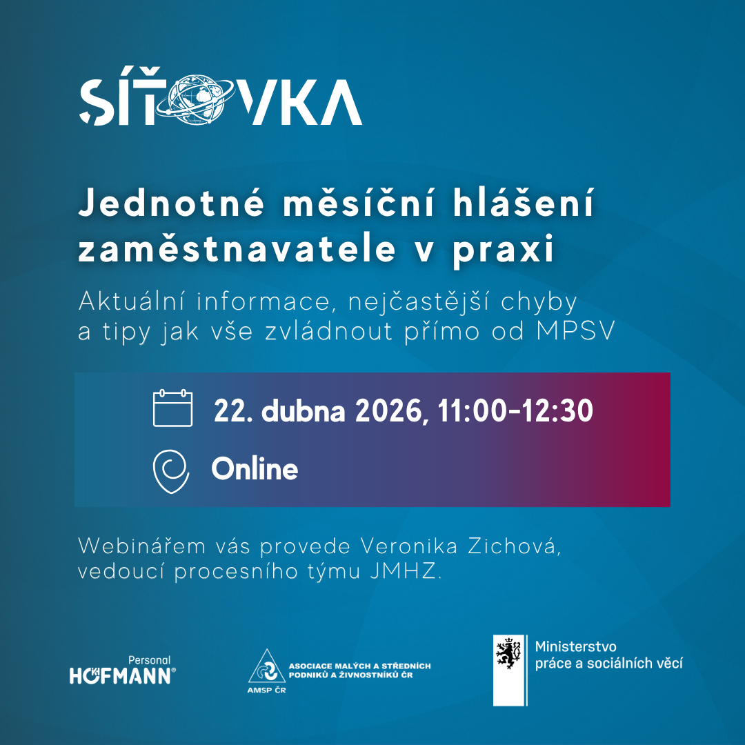 Jednotné měsíční hlášení zaměstnavatele je tady a s ním i spousta dotazů z praxe. Proto jsme pro vás ve spolupráci s MPSV a Hofmann Personal s.r.o. připravili webinář 22. dubna 2026, 11:00 - 12:30 h, který vám pomůže se v JMHZ rychle zorientovat.