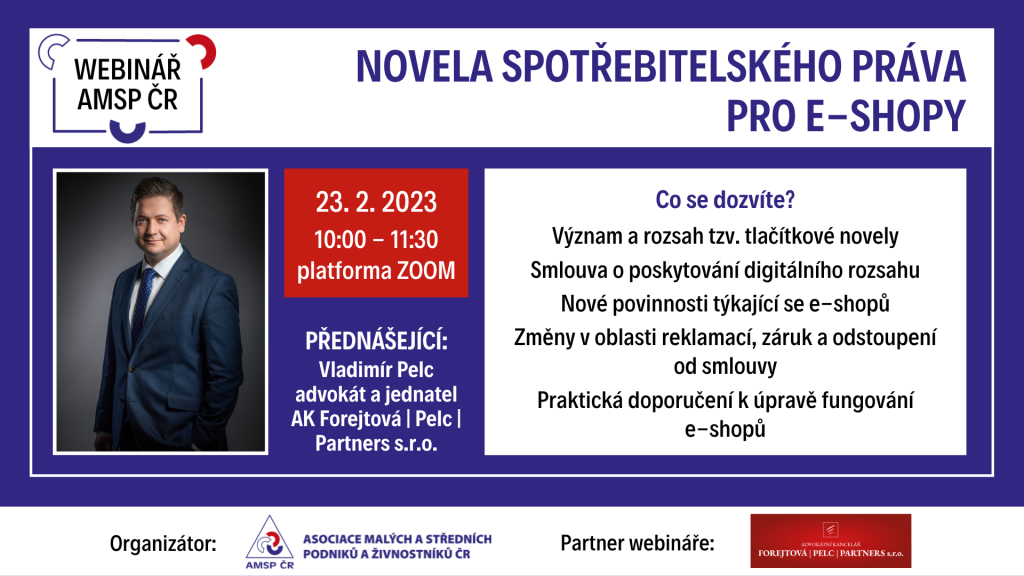S účinností od 6. ledna 2023 byl zákonem č. 374/2022 Sb. novelizován zákon o ochraně spotřebitele a občanský zákoník. Jedná se o první významnou digitalizační novelu občanského zákoníku, který je účinný od roku 2014. Tzv. tlačítková novela zavádí řadu nových povinností podnikatelů, přičemž porušení některých z povinností stanovených občanským zákoníkem může být přestupkem. Novela dále mění dosavadní právní úpravu napříč spotřebitelským právem jako celkem. Nejvýraznější změny je možné zaznamenat v oblastech reklamací, recenzí, slev či nekalých obchodních praktik v oblasti prodeje zboží spotřebitelům. Novelou je dále zaveden zcela nový druh smlouvy – o poskytování digitálního obsahu. Webinář je zaměřen na nejzásadnější změny spotřebitelského práva, které zasáhnou provozovatele e-shopů.