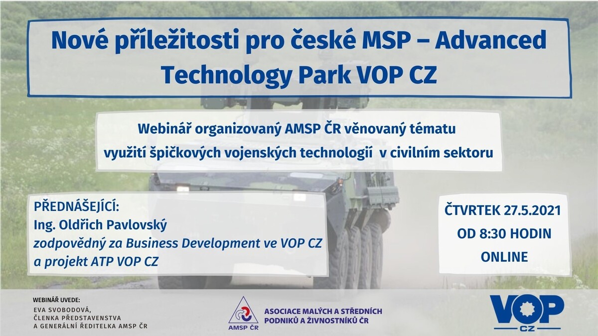 Dovolujeme si Vás pozvat na webinář společnosti VOP CZ (Vojenský opravárenský podnik), profilující se v oblasti vojenské techniky, strojírenské výroby a vývoje. Podnik se zabývá především opravami vojenské techniky a strojírenskou výrobou, ale na vlastní vývoj navazuje modernizace a výroba vojenské techniky a výroba civilních produktů.