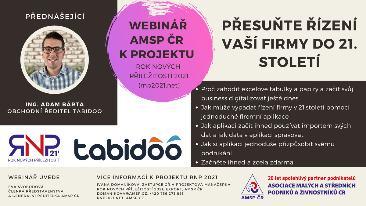 Rádi bychom Vás jménem Asociace malých a středních podniků a živnostníků ČR pozvali na nadcházející webinář na téma: „Přesuňte řízení Vaší firmy do 21. století“. Online webinář pro vás připravila společnost Tabidoo pod záštitou našeho projektu Rok nových příležitostí 2021.